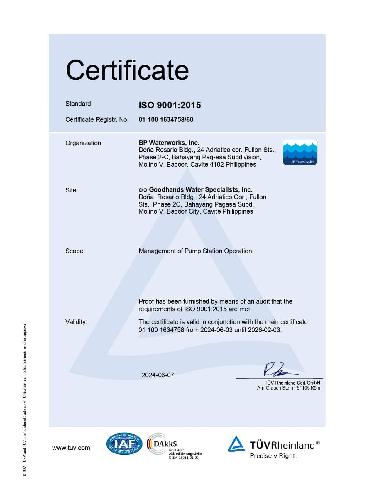 Goodhands Water Specialists, Inc. has been granted ISO 9001-2015 Certification by TUV Rheinland Philippines in June 2024. This certification demonstrates our commitment to meet customers and stakeholders satisfaction and needs and to protect the environment through responsible environmental management practices.